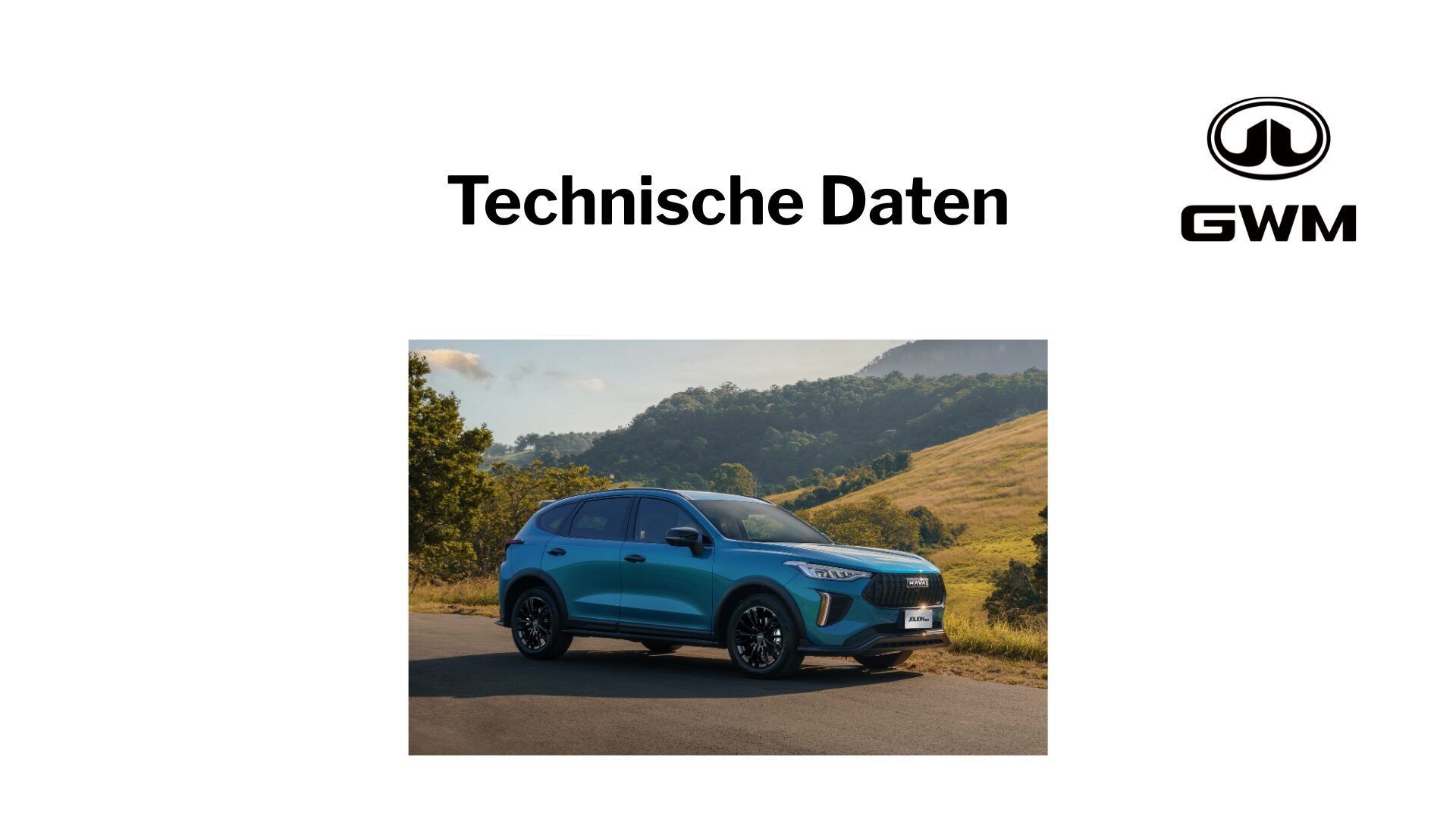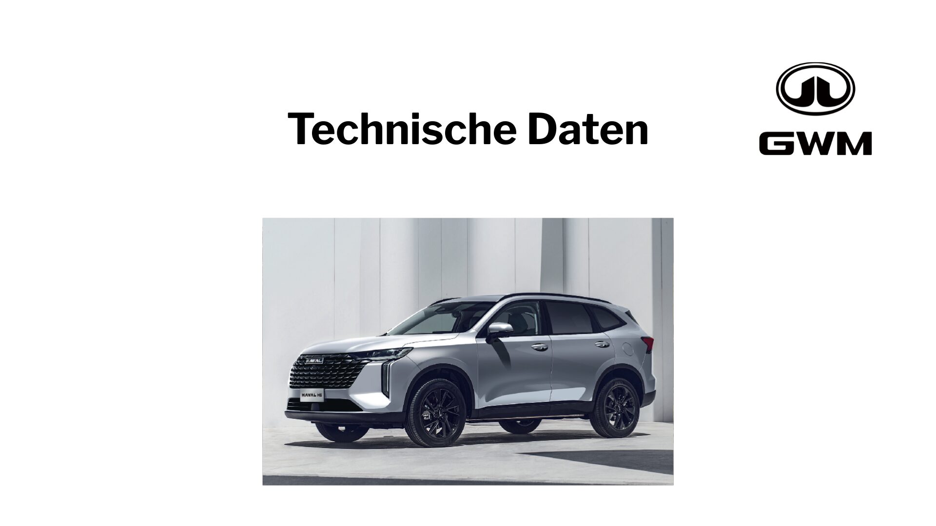 ORA 03 Energieverbrauch 16,5-16,8 kWh/100 km Strom; CO2-Emission 0 g/km; CO2-Klasse A; kombinierte Werte. || ORA 07 Pure / Pro, 67 kWh Batterie, 150 kW (204 PS) FWD Energieverbrauch 16,5 kWh / 100 km Strom; CO2-Emission 0 g / km; CO2-Klasse A; ORA 07 GT, 86 kWh Batterie, 300 kW (408 PS) AWD 17,5 kWh / 100 km Strom; CO2-Emission 0 g / km; CO2-Klasse A; kombinierte Werte. || WEY 05 Plug-in Hybrid 2.0 150 kW (204 PS), Elektromotoren vorn 120 kW (163 PS) / hinten 135 kW (184 PS), Systemleistung 350 kW (476 PS) Energieverbrauch 25,5 kWh/100 km Strom & 0,5 l/100 km Benzin; CO2-Emission 12 g/km; CO2-Klasse B; gewichtet kombinierte Werte. Bei entladener Batterie: Energieverbrauch 8,0 l/100 km Benzin; CO2-Klasse G; kombinierte Werte. || WEY 03 Plug-in Hybrid; Antrieb: FWD 2.0 150 kW (204 PS), Elektromotor 120 kW (163 PS), Systemleistung 270 kW (367 PS) Energieverbrauch 25,5 kWh/100 km Strom & 0,6 l/100 km Benzin; CO2-Emission 15 g/km; CO2-Klasse B; gewichtet kombinierte Werte. Bei entladener Batterie: Energieverbrauch 8,1 l/100 km Benzin; CO2-Klasse G; kombinierte Werte. Antrieb: AWD 2.0 150 kW (204 PS), Elektromotoren vorn 120 kW (163 PS) /hinten 135 kW (184 PS), Systemleistung 325 kW (442 PS) Energieverbrauch 25,1 kWh/100 km Strom & 0,5 l/100 km Benzin; CO2-Emission 15 g/km; CO2-Klasse B; gewichtet kombinierte Werte. Bei entladener Batterie: Energieverbrauch 8,1 l/100 km Benzin; CO2-Klasse G; kombinierte Werte. || GWM HAVAL H6 Hybrid 1.5 Turbo 110 kW (150 PS), Elektromotor 130 kW (177 PS), Systemleistung 179 kW (243 PS) Energieverbrauch 5,9 l/100 km Benzin; CO2-Emission 134 g/km; CO2-Klasse D; kombinierte Werte. || GWM HAVAL Jolion Pro 1.5 Turbo 130 kW (177 PS) 7-Gang-DCT Energieverbrauch 7,4 l/100 km Benzin; CO2-Emission 167 g/km; CO2-Klasse F; kombinierte Werte.**